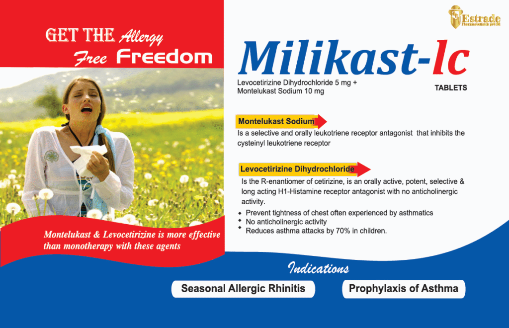 Mlikast-LC is a once-daily fixed-dose combination tablet that pairs levocetirizine (a potent, long-acting R-enantiomer H₁-antihistamine) with montelukast (a selective oral cysteinyl-leukotriene receptor antagonist). The combination provides complementary mechanisms—rapid antihistaminic relief of nasal/ocular symptoms and leukotriene-mediated anti-inflammatory control of lower airway and nasal inflammation—leading to superior symptom control versus monotherapy in multiple randomized trials and meta-analyses (Kim et al., 2024; Kim, 2025). Indicated for seasonal allergic rhinitis and as prophylaxis in patients with allergic rhinitis and coexisting asthma, Mlikast-LC aims to reduce symptom burden and lower the risk of asthma exacerbations when used under physician supervision.